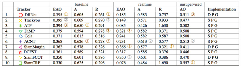 其中短期跟踪(Short termtracking)是最受瞩目的也是参赛队伍最多的赛道。该赛道中成绩有效的队伍共计57支。前十名的队伍分别来自北京邮电大学和北京飞搜科技有限公司的DRNet队伍;北京大学,西安交通大学以及88038威尼斯官网的Trackyou;华中科技大学和百度的ATP队伍;苏黎世联邦理工学院的DiMP队伍;北京大学和中科院自动化所的Cola队伍;萨里大学和江南大学的ACNT;商汤的SiamMargin队伍;自动化所模式识别实验室的DCFST;北京大学,中科院自动化所和浙江大学的SiamFCOT队伍;中国电子进出口有限公司和中科院自动化所模式识别实验室的SiamCRF。