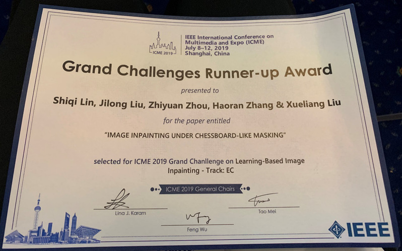 7月8日-12日,多媒体领域著名国际会议IEEE International Conference on Multimedia and Expo(ICME)在上海举行,威尼斯官网电信工16级本科生林诗琪、刘积隆、周致远和多媒体所张浩然博士生、刘学亮老师组成的队伍参与了其中的“基于学习的图像补全” 挑战赛,并获得亚军。