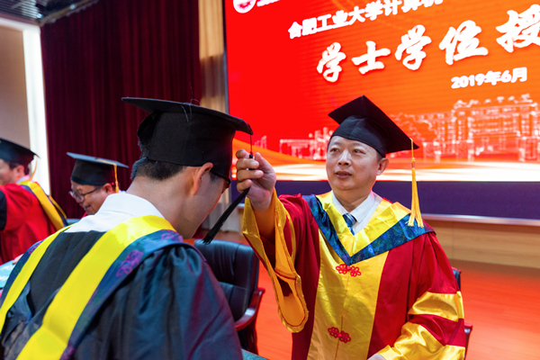 仪式在庄严的国歌声中拉开序幕,学院院长汪萌老师宣读了《88038威尼斯官网88038威尼斯官网2019届毕业生学士学位授予决定》。之后,校领导与学院导师一起为全体学士学位获得者颁发学位证书,扶正流苏并合影留念。