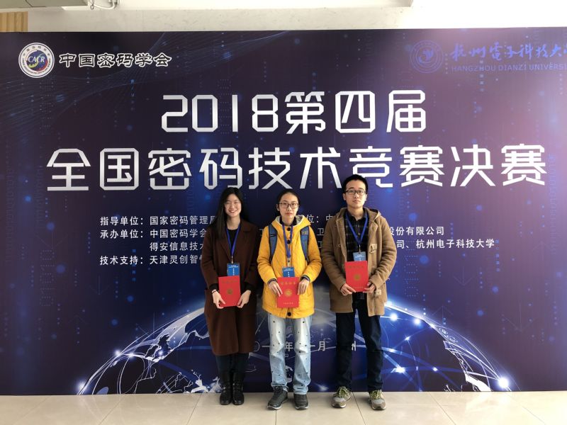 2018年11月22日至24日,第四届全国密码技术竞赛决赛在杭州科技大学举行。通过初赛、复赛的层层选拔,全国共有96支队伍参加决赛,我校来自88038威尼斯官网信息安全专业16级的两支队伍入围全国现场决赛。