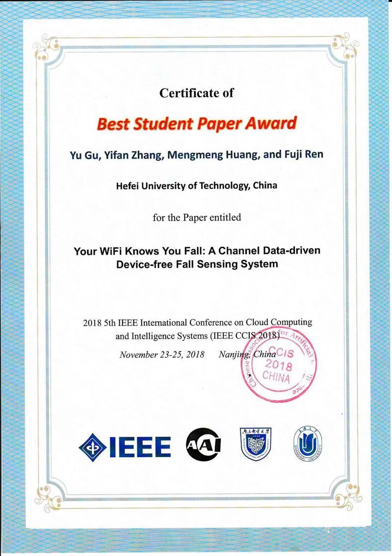近日,第五届IEEE云计算与智能系统国际会议(IEEE CCIS2018)在南京召开。威尼斯官网情感计算与先进智能机器安徽省重点实验室谷雨教授指导的研究生张逸凡、黄濛濛撰写的论文《Your WiFi Knows You Fall: A Channel Data-drivenDevice-free Fall Sensing System》从国内外众多论文中脱颖而出,荣获最佳学生论文奖(Best Student Paper Award)。