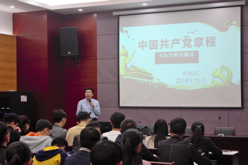 仪式后,张炳武书记做了《党章、党员、党的组织》的报告,报告主要围绕十九大最新修订的党章内容。针对党章中修改的内容详细讲解,普及党的基本知识,深刻阐述了习近平新时代中国特色社会主义思想。希望学员们进一步加强对党的认识,明确自己接下来在成为党员过程中要走的道路。入党积极分子要以党员标准严于律己,争做高素质创新人才,为党和使命不懈奋斗,奉献自己的青春力量。