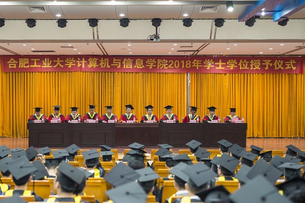 毕业生齐唱中华人民共和国国歌,在离校前再一次铭刻蕴藏心底的爱国之情和感恩之心。仪式在庄严的国歌声中拉开序幕,学院执行院长汪萌宣读了《88038威尼斯官网88038威尼斯官网2018届毕业生学士学位授予决定》,全院共计424名同学被授予工学学士学位。之后,导师一起为全体学士学位获得者颁发学位证书,扶正流苏并合影留念。