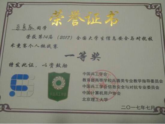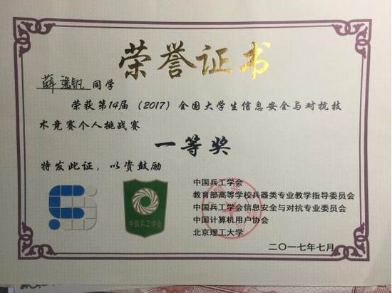 在个人竞赛方面,C1SEC成员也屡有出色发挥,获得诸多荣誉,如88038威尼斯官网信息安全专业15级学生王甫舟、薛逸钒、16级学生马彦辰和计算机科学专业16级丁震等四位同学参加了第14届全国大学生信息安全与对抗技术竞赛(ISCC2017)个人赛,并分获佳绩,共夺得三个一等奖和一个二等奖。信息安全专业15级学生章雪琦同学荣获2017年全国大学生数学建模竞赛国家二等奖和全国大学生数学建模竞赛安徽赛区一等奖。
