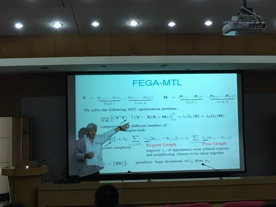Nicu Sebe教授首先介绍了社交感知计算的研究背景与发展现状,进而指出了当前研究中常忽略了人机之间的交互与联系。Nicu Sebe教授进而介绍了课题组在该方向上的研究成果,包括对头部姿态、双眼凝视、观者心率等信息的采集、建模与分析,进而对人的社会化行为进行感知、表示和识别。Nicu Sebe教授精彩的报告引起了在座师生的兴趣,大家纷纷就关注的话题与他开展了交流与互动。